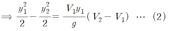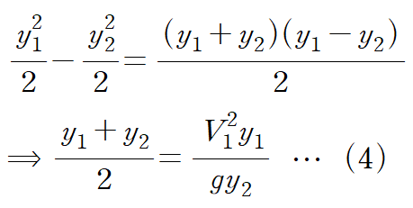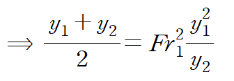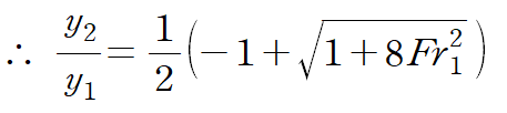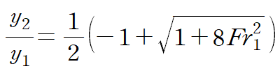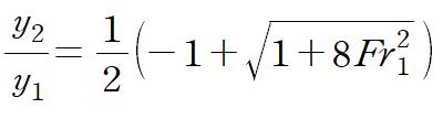 아래 관계식은 수력도약 전의 유동 깊이(y1)와 이후의 유동 깊이(y2)의 관계식을 나타낸 식입니다.(Fr : Froud number)