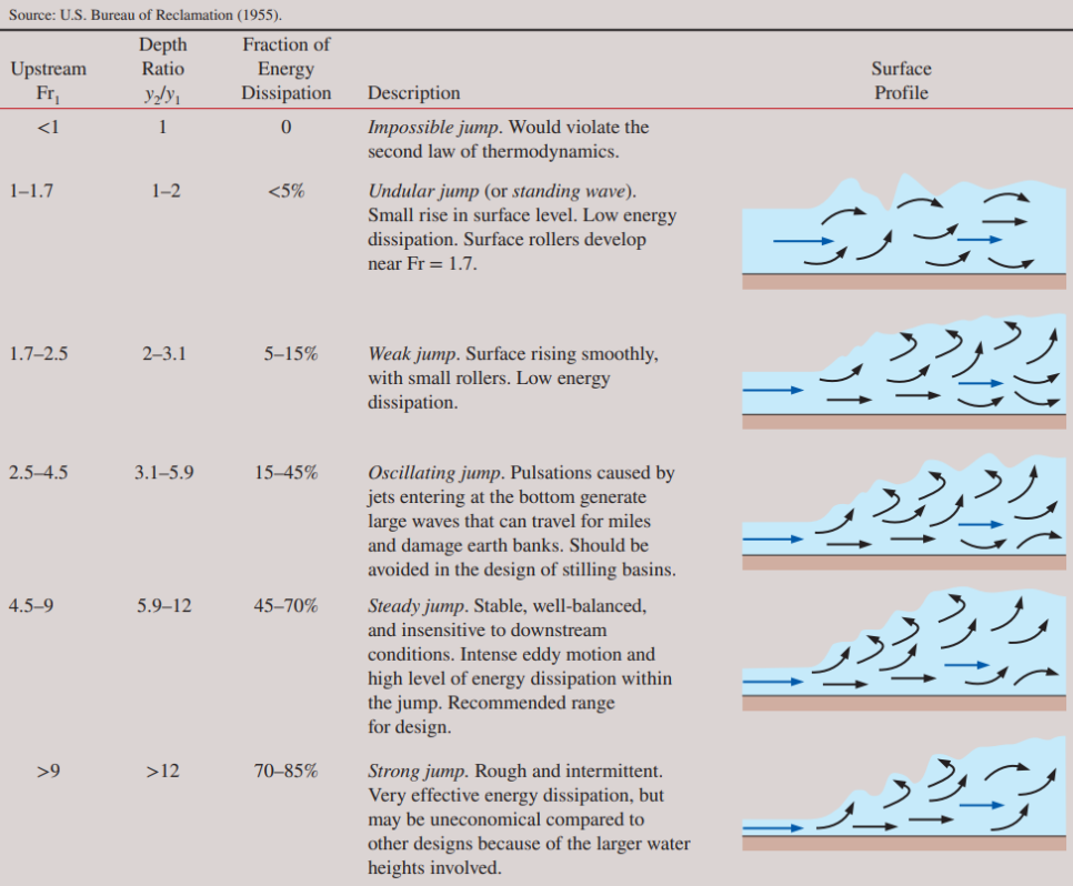Froud number에 따른 수력도약 현상은 다음과 같습니다.
