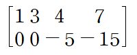 두 번째 행 중 가장 왼쪽에 위치한 항이 0이 되도록(정확히는 첫 번째 행에 위치한 leading entry 아래가 0이 되도록) 첫 번째 행에 -3을 곱한 것과 두 번째 행을 더하는 ERO(기초 행 연산, Elementary Row Operation)을 수행합시다