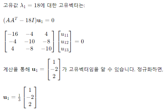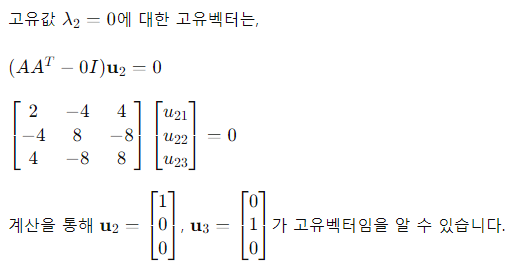 위 문제의 경우 두 번째 특이값이 0이기 때문에 u1만을 위 공식으로 빠르게 구할 수 있습니다.