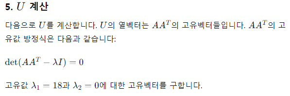 > V를 먼저 구하고 U를 구하는 순서로 진행되는데 실질적으로 U를 구할 때, 만약 특이값이 0이 나오지 않았다면 AAt의 고유값을 직접 구하기보다 아래 공식을 사용해서 빠르게 구합니다.