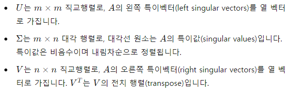 특이값 분해(SVD)는 대각화가 nxn 정방행렬만 가능한 것과 달리, 일반적인 mxn 행렬에 대해서 수행할 수 있습니다.