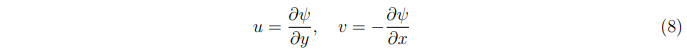 유동함수(stream function) ψ는 다음과 같이 속도 성분 u와 v와 관련됩니다:
