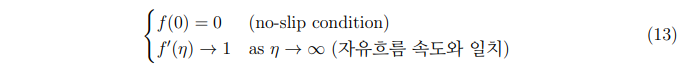 블라시우스 방정식은 3차 비선형 상미분 방정식으로, 일반적으로 수치적으로 풀립니다. RK 4th method를 사용해 풀 수 있고, 그 해는 이미 구해져 있습니다.