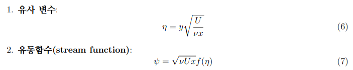 위 방정식을 풀기 위해 유사 변환을 사용합니다. 유사 변수 η(eta) 와 유동함수(stream function) ψ(psi) 를 도입합니다 :