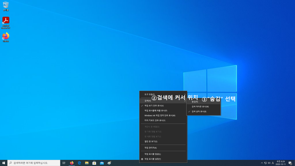 Windows10은 시작 버튼 오른쪽에 검색바가 위치한다. 이 검색바를 숨기게 되면 표시할 수 있는 프로그램의 수가 많아져서 멀티태스킹이 유용해질 가능성?이 존재한다. 본인은 검색바를 별로 쓰지도 않는데 자리 차지하는 게 보기 싫어서 그냥 숨겨버렸다. 매우 간단한 방법인데, 모르는 사람이 생각보다 많아서 포스팅을 하게 되었다. 다른 어떤 이유로든 검색바를 숨기고 싶은 사람이 있을 텐데 이 방법으로 해결할 수 있으니 얼른 보고 본 업무로 돌아가자.