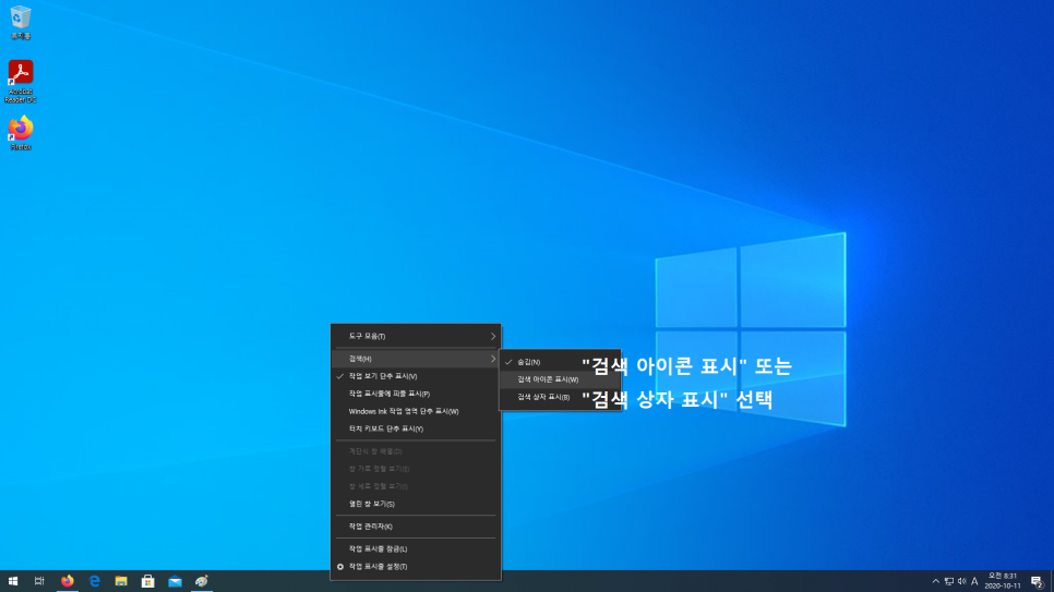 검색바를 다시 보이게 하고 싶다면 검색 아이콘 표시 또는 검색 상자 표시를 선택해주면 원상태로 돌아온다