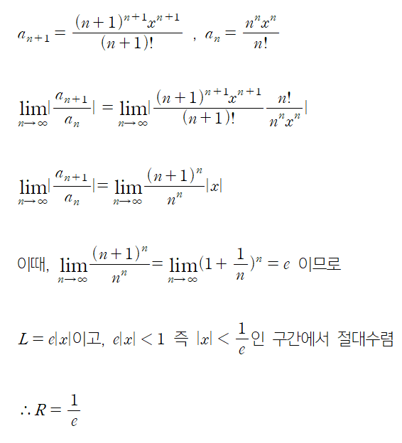 수렴반경만 조사하라고 했으니, 각 구간의 끝값에서 수렴하는지는 또다른 문제입니다. 예제 3번의 경우 x=±1/e 에서 L=1이므로 다른 판정법을 이용해서 수렴 /발산을 확인해주어야 합니다