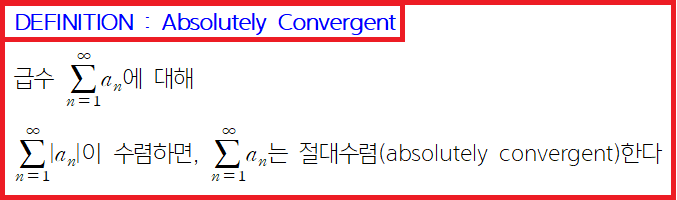 비판정법의 정의는 참 간단합니다. 그런데 그냥 수렴이 아니라 절대수렴이라고 나와있죠? 이 절대수렴의 개념 또한 간단합니다
