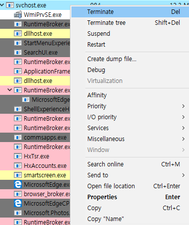 Terminate tree는 선택한 프로세스의 하위 프로세스까지 한꺼번에 종료하는 명령이다.