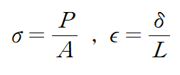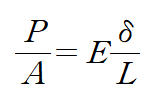 위 식은 응력과 변형률의 정의입니다. P는 가한 힘, A는 봉의 단면적, L은 봉의 길이, δ는 봉의 변위를 의미합니다.훅의 법칙에 대입하여 정리하면 다음과 같습니다.