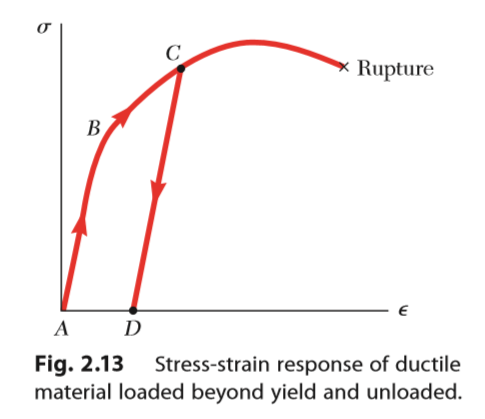 위 그래프는 물질의 응력-변형률 선도(stress-strain diagram)라고 합니다. 가로와 세로 축을 보면 변형률과 응력 기호가 나와있지요? 직관적으로 알 수 있듯이 A-B구간은 선형 구간, B 이후로는 비선형 구간입니다. Rupture는 파단(파열)점을 의미합니다. A-B 구간에서는 선형 탄성 구간이기에, 하중을 제거했을 때 원상태(A)로 돌아오지만 비선형 구간(C)에서 하중 제거 시 원상태로 돌아오지 않습니다. 변형률이 D만큼 발생한 상태가 됩니다. 그래프의 화살표는 하중을 C점에 도달할 때까지 주었다가 제거하였을 때 물질의 거동을 나타낸 것입니다.
