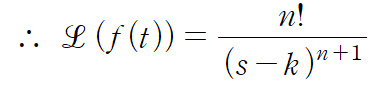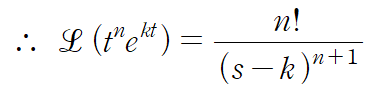 두 가지 방법으로 라플라스 변환을 구해보겠습니다. 첫 번째 방법은 s-shifting을 이용한 방법입니다. e^kt가 곱해져있으니, t^n 의 라플라스 변환에 s-shifting theorem 을 적용해주면 됩니다.