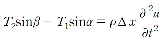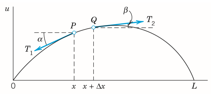 PQ구간을 보면, 외력인 두 장력의 합이(부호는 u방향이 +) 질량 곱하기 가속도임을 알 수 있습니다. 이때 ρ는 줄의 단위길이당 질량입니다. PQ구간의 길이가 Δx 이므로 질량이 ρΔx이고, 가속도는 u를 t에 대해 두 번 (편)미분한 것이 됩니다.