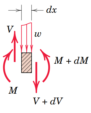 위와 같이 미소 구간에 대한 간단한 FBD 분석으로 재료에 발생하는 전단력과 굽힘 모멘트를 유도할 수 있습니다.