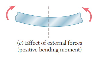 다음은 굽힘모멘트입니다. 아래 그림은 보에 실제적으로 발생하는 굽힘에 대하여 양의 굽힘모멘트를 나타낸 것입니다. 보가 아래로 튀어나오게 하는 굽힘모멘트가 양(+)의 방향 입니다. 즉 U자를 그리면 양의 방향입니다.