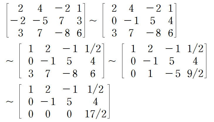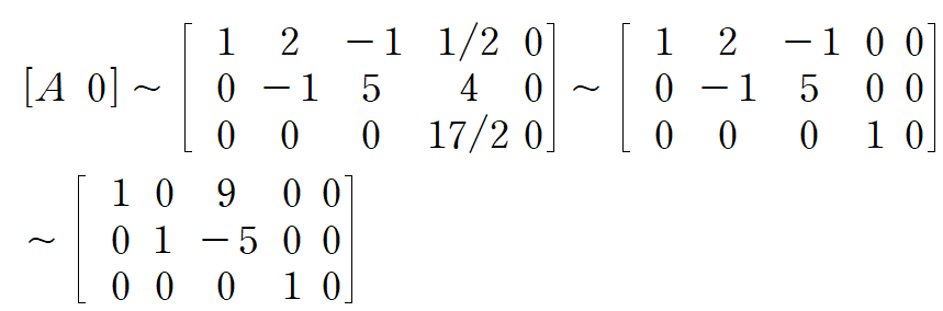 해의 존재성은 Echelon form으로 바꿨을 때 [0 0 . . . c ] (c≠0)인 행의 존재유무로 판별할 수 있습니다. 저 행이 없으면 해가 존재하고(consistent) 있으면 해가 존재하지 않습니다 (inconsistent)
