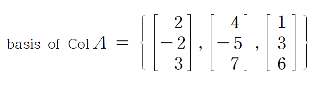 행렬 A의 Echelon form이 3개의 피벗을 가집니다. 따라서 행렬 A는 R3를 span하며 1, 2, 4 번째 열벡터가(이 경우 처음 A의 열벡터) Col A의 기저가 됩니다