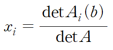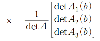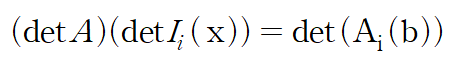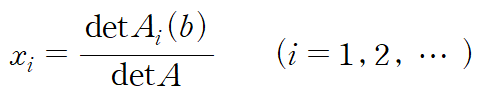 A가 n x n 가역행렬일 때(역행렬 존재), 모든 n x 1 열벡터 b에 대하여 Ax=b에 대한 유일해 x 는 다음 xi로 나타내지는 성분(entry)를 가진다