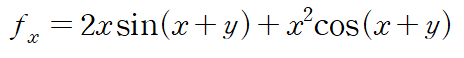 먼저 x에 대한 편미분을 시행할 건데, y를 상수취급해도 두 함수가 곱해진 꼴이니, 곱의 미분법을 사용하여 편도함수를 구합니다 ( (fg)'=f'g+fg')