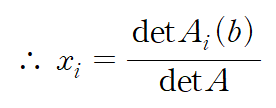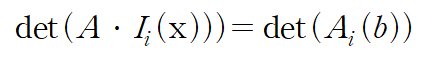 A가 n x n 가역행렬일 때(역행렬 존재), 모든 n x 1 열벡터 b에 대하여 Ax=b에 대한 유일해 x 는 다음 xi로 나타내지는 성분(entry)를 가진다