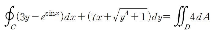 이때 P와 Q가 영역 D에서 편도함수를 가진다면 곡선 C에 대한 F의 선적분은 영역 D에서 Qx-Py 의 중적분과 같다.