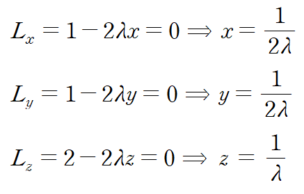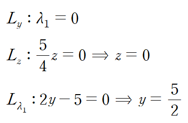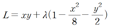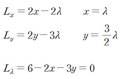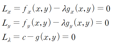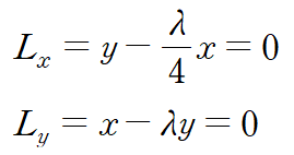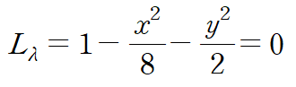 L을 x와 y에 대해 미분합니다. 아래는 L의 임계점을 구하는 과정입니다.