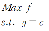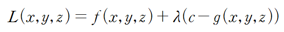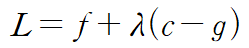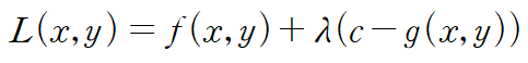 위 식은 g=c인 제약조건 하에서 f의 최댓값을 구하라는 뜻입니다. 최솟값의 경우 min으로 표시하는데 보통 위와 같은 최적화 문제를 풀 때는 임계점과 구간의 끝점에서 함숫값을 비교해 해를 구합니다. 라그랑주 승수법은 제약조건 하에서 최적화 문제를 해결하기 위한 방법으로 λ (Lagrange multiplier) 를 이용해 설정한 함수 L를 이용해 구할 수 있습니다.
