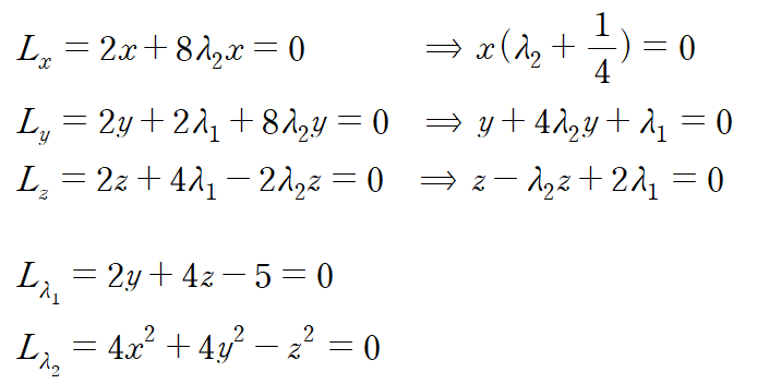 각각의 임계점에 대해 편도함수를 0으로 만드는 λ1, λ2 가 존재하므로 이로써 모든 조건을 만족시킵니다.