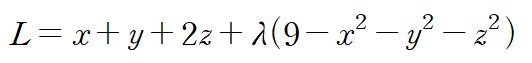 (예제 3) (x,y,z) 공간 상에서 중심이 원점이고 반지름이 3인 구에 대해 x+y+2z의 최대, 최소를 구하여라
