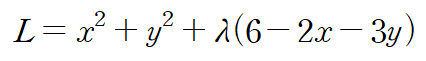 (예제 2) g(x,y)=2x+3y-6=0 위의 점 중 원점으로부터의 최단거리를 구하여라