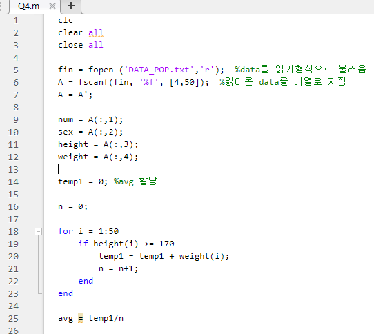 m파일을 실행하면 m파일의 명령어는 표시되지 않고 스크립트 내에서 출력하고자 하는 결과물만 명령창에 표시됨.(;사용 안 한 줄)