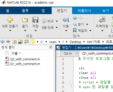 m파일의 실행은 m파일이 저장된 폴더가 working folder로 지정된 상황에서만 가능하다.