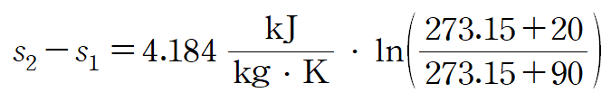 (예제) 1kg의 물이 20도에서 90도로 가열할 때 비열을 상수라 가정하고 엔트로피 변화를 구하여라.